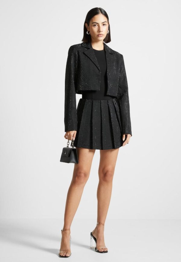 This Rhinestone Cropped Blazer is sure to make a statement with its glamorous, stylish look. The sleek black design is the perfect addition to any wardrobe, and the glistening rhinestones will turn heads.