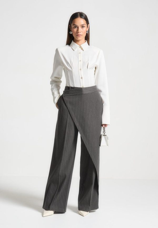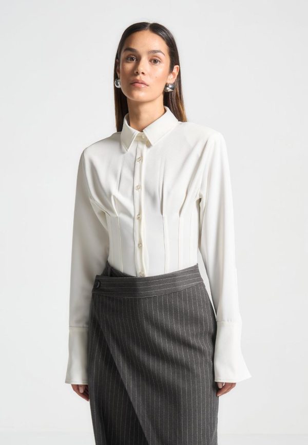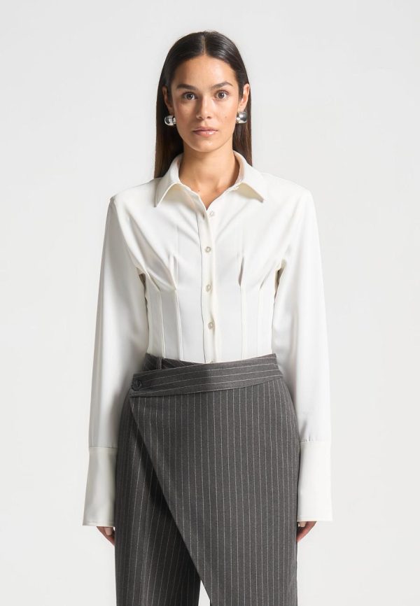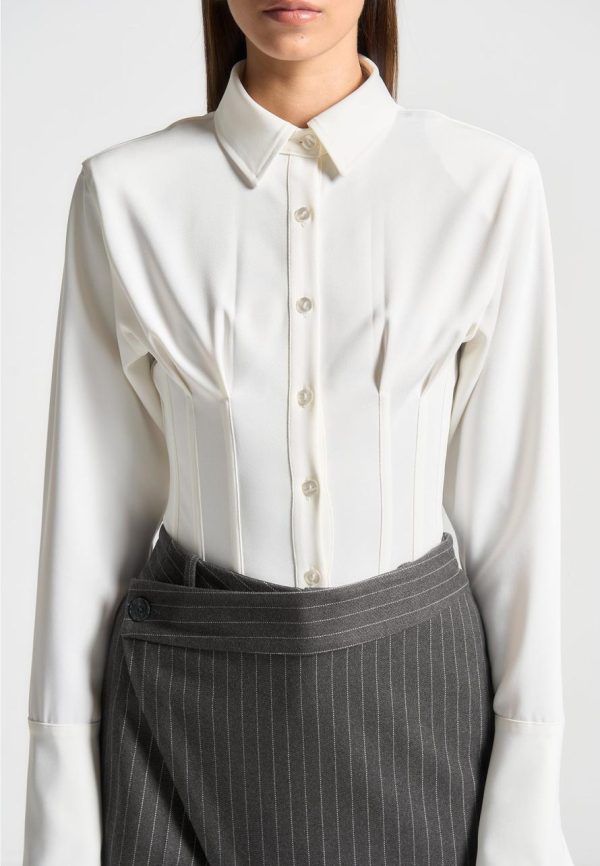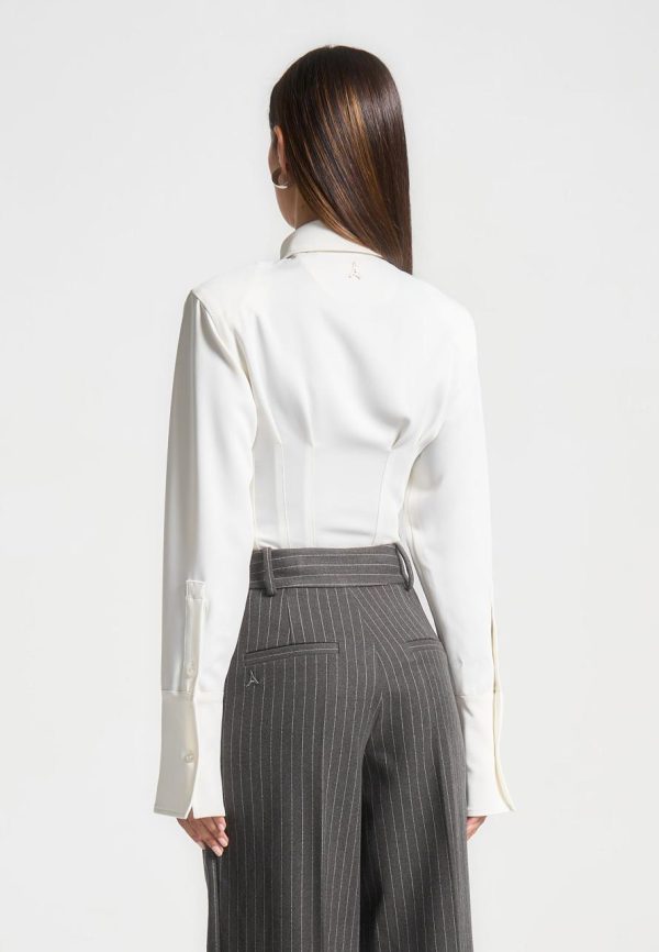 Introducing the Corset Shirt Bodysuit in Off-White. This stylish garment features a contoured shirt design, providing a flattering and comfortable fit. Made with quality materials, this bodysuit is perfect for any occasion.