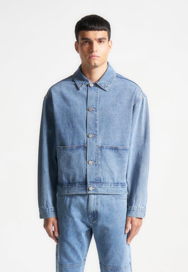 Introducing the Contrast Stitch Carpenter Jacket in Mid Blue. Crafted from high quality, denim fabric this Jacket embodies both style and durability. The wide front pockets offer convenience, while the cross-over pleated design elevates the aesthetic appeal. Pair with the Contrast Stitch Carpenter Jean in Mid Blue for a completed ensemble.