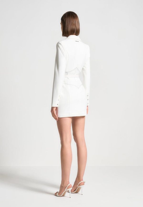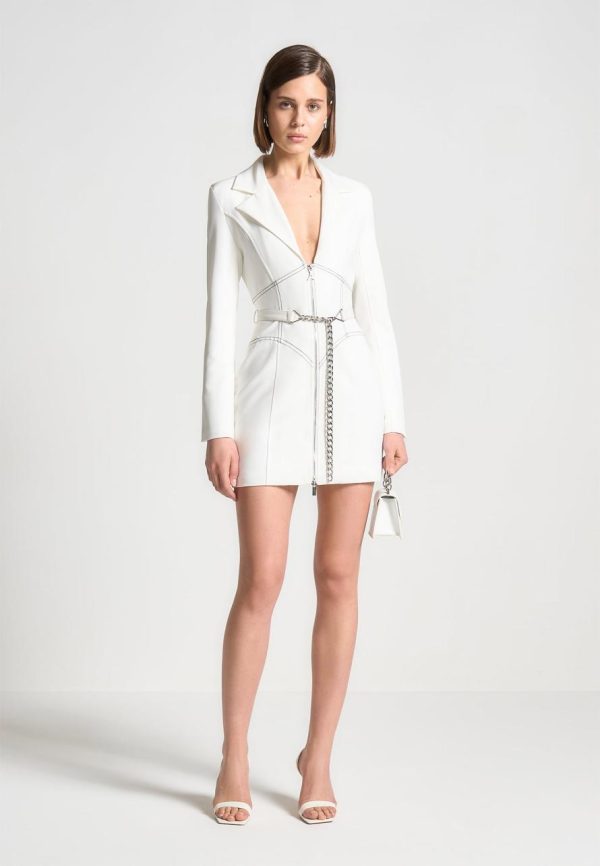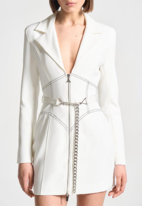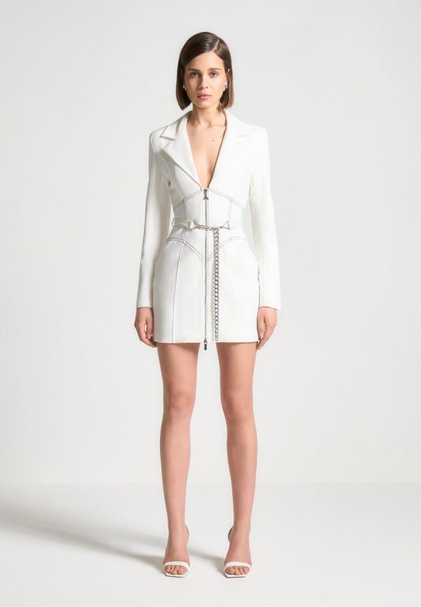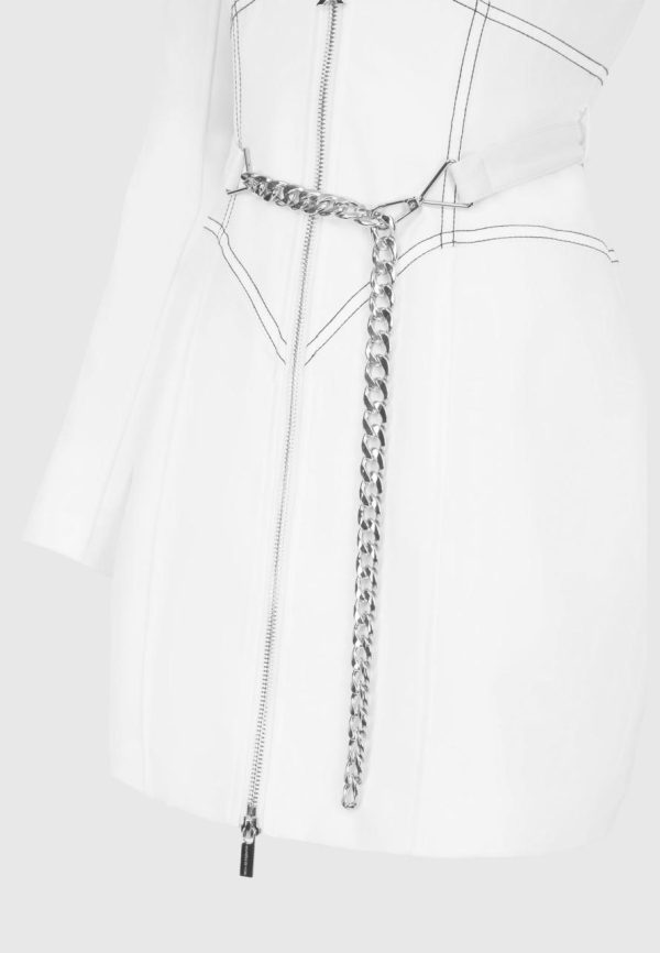 Our Corset Blazer Dress with Chain Dress is designed for a flattering fit to elevate your look in any occasion. Crafted with a contrast stitched corset, this wardrobe staple will be the perfect addition to your closet.