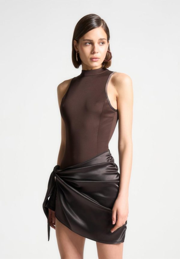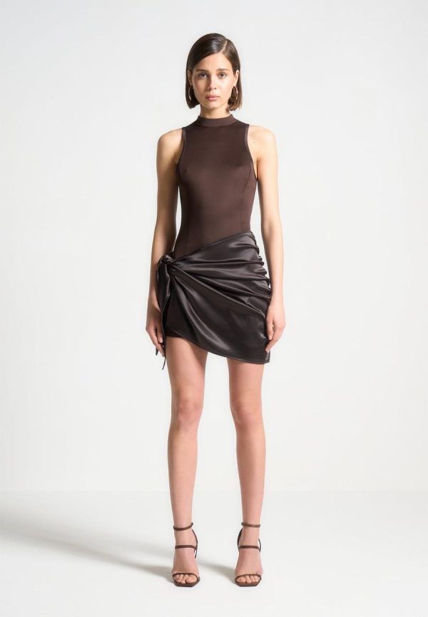 A sexy addition to our dress collection, this bodycon dress perfectly contrasts in fabric to make this an eye catching piece. The satin wrap adds body to the silhouette and provides a contouring illusion from the slim fit waist. We recommend sizing up if you are in between sizes.