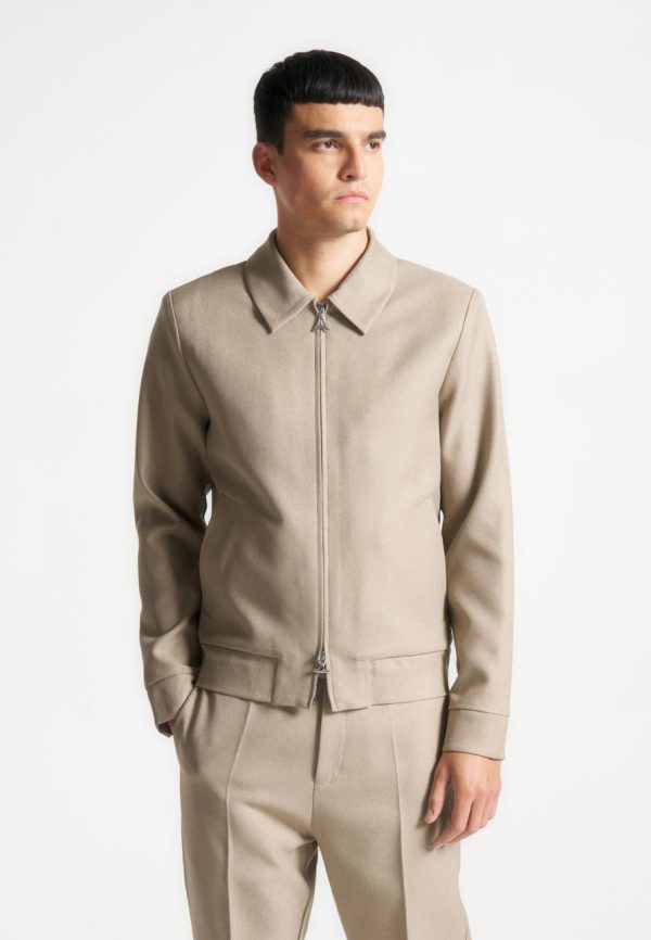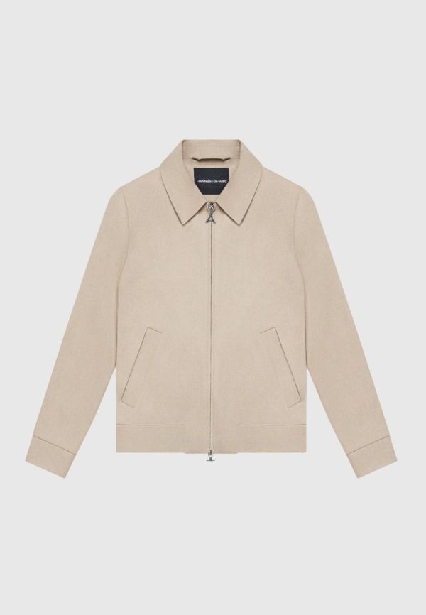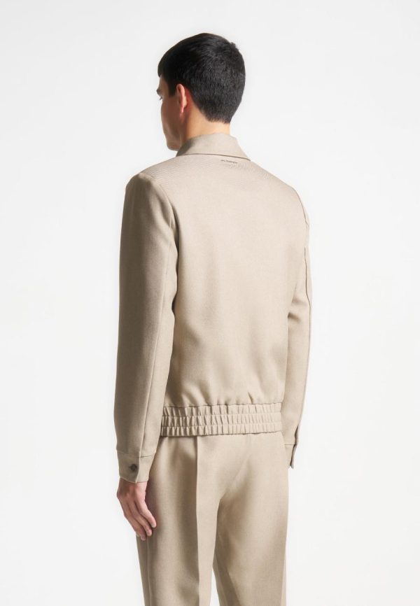 Introducing our Tailored Harrington Jacket in Beige, a modern essential with timeless appeal. Designed for both style and comfort, it features an elasticated hem, front welt pockets, and a classic harrington collar. The front zip, accented with a Silver Eiffel Puller, adds a touch of refinement to this versatile piece. Pair with the Slim Fit Pleated Tailored Trouser in Beige for a completed ensemble.