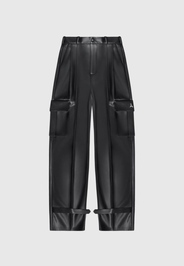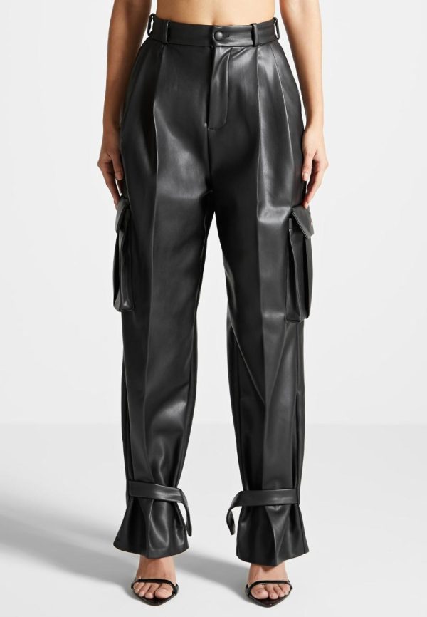 Our Vegan Leather Pleated Cargo Trousers, crafted in beige, feature a tailored fit for a sleek silhouette, as well as cargo features for enhanced utility. The trousers have a wide-leg cut that is perfect for an effortless look.