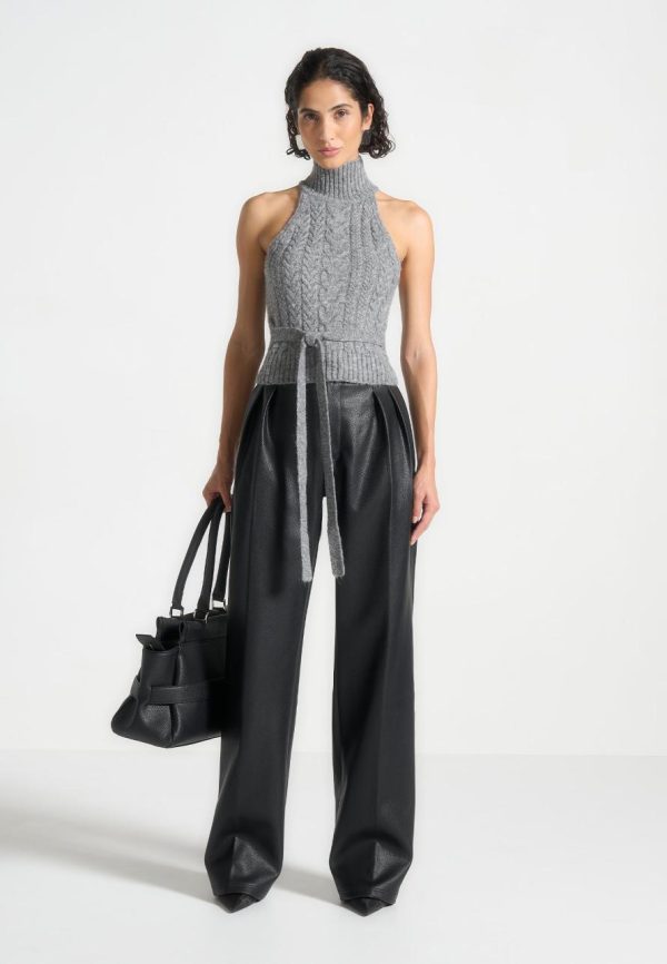 Expertly crafted from high-quality pebbled leather, these trousers feature a flattering wide leg design with twin pleats for a chic and stylish look. The stacked design adds an extra touch of sophistication. These trousers are perfect for any occasion, combining style and comfort.