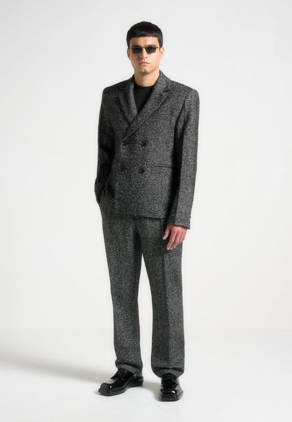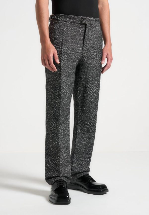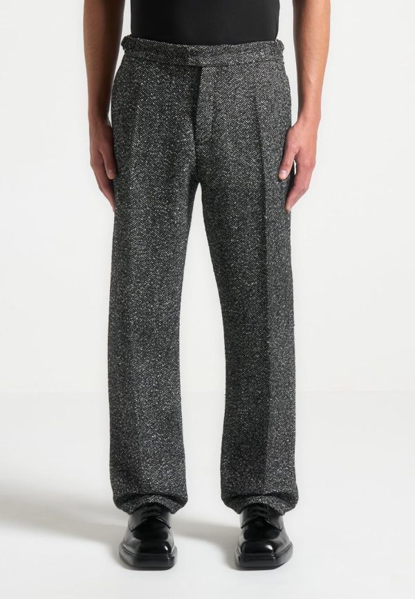 The Relaxed Fit Herringbone Pleated Trousers in Black offer a modern touch to a classic herringbone print. Designed with side adjusters for a customisable fit and a single pleat for a refined look, these durable trousers are made from a blend of 50% wool and 50% polyester. Pair with the Boxy Herringbone Jacket for a seamless look.