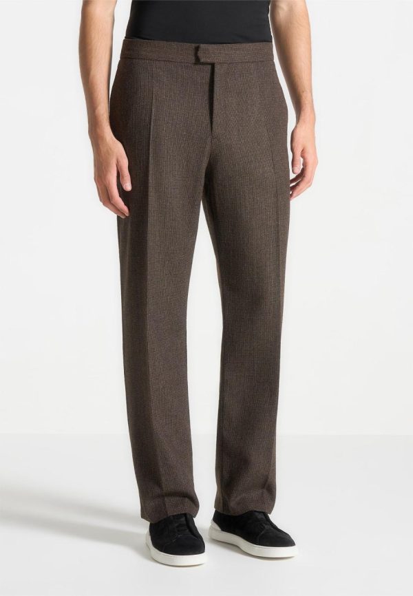 The Regular Fit Houndstooth Wool-Blend Trousers in Brown offer a refined take on classic menswear, crafted from a premium wool blend for warmth and durability. With a tailored, regular fit and straight leg, they feature a flat front, zip fly, and precision stitching. Side and welted back pockets add functionality to this elevated, timeless design.