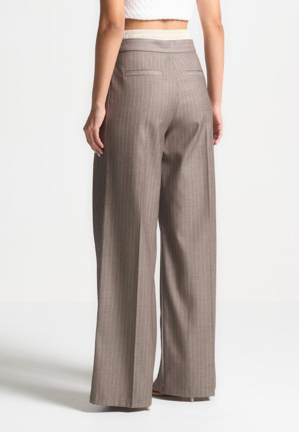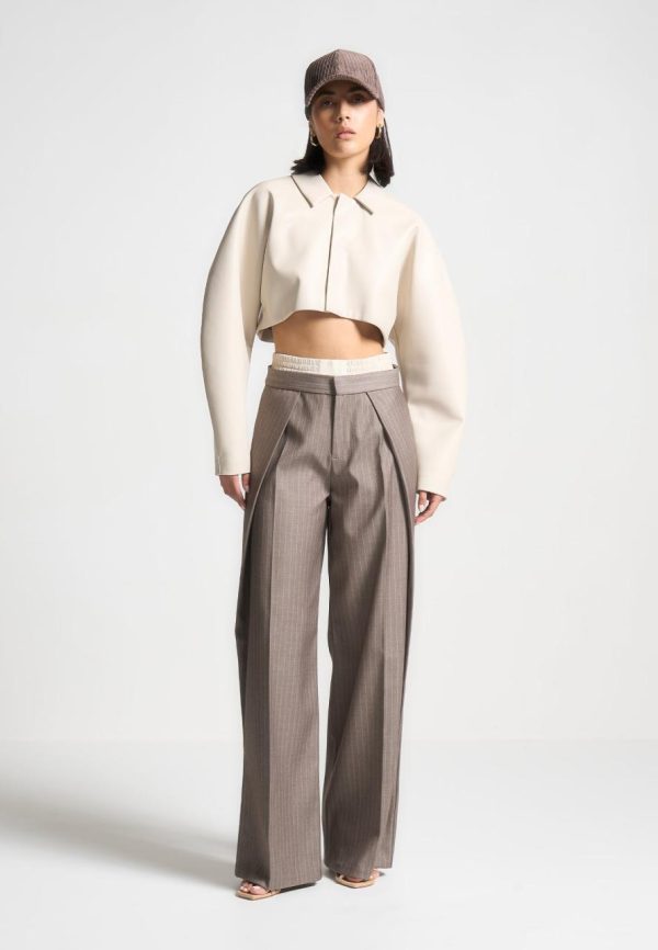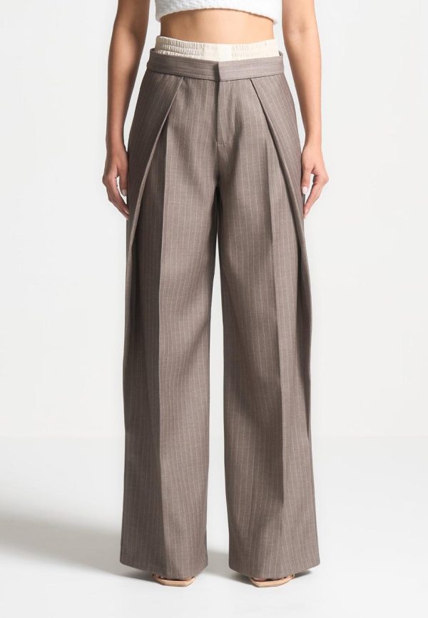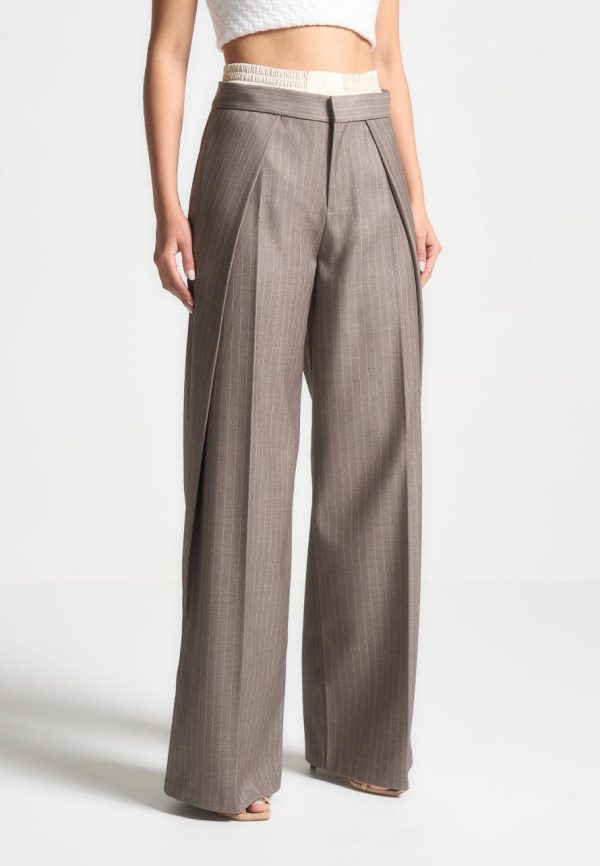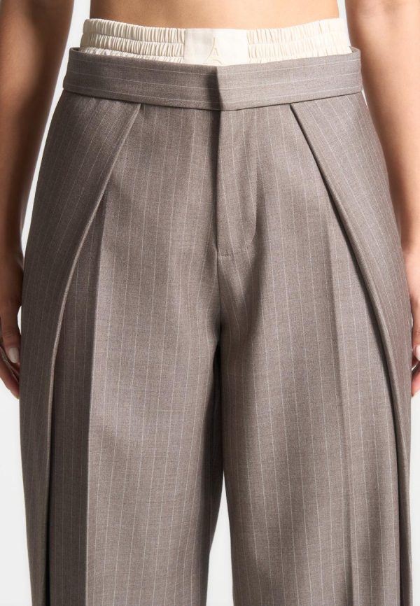 Expertly designed for versatility, these Satin Waistband Pinstripe Trousers are a must-have for any wardrobe. Featuring a double waistband and wide leg, these trousers offer a flattering fit and can be dressed up or down for any occasion. Sleek and stylish, these trousers are a timeless addition to your wardrobe.