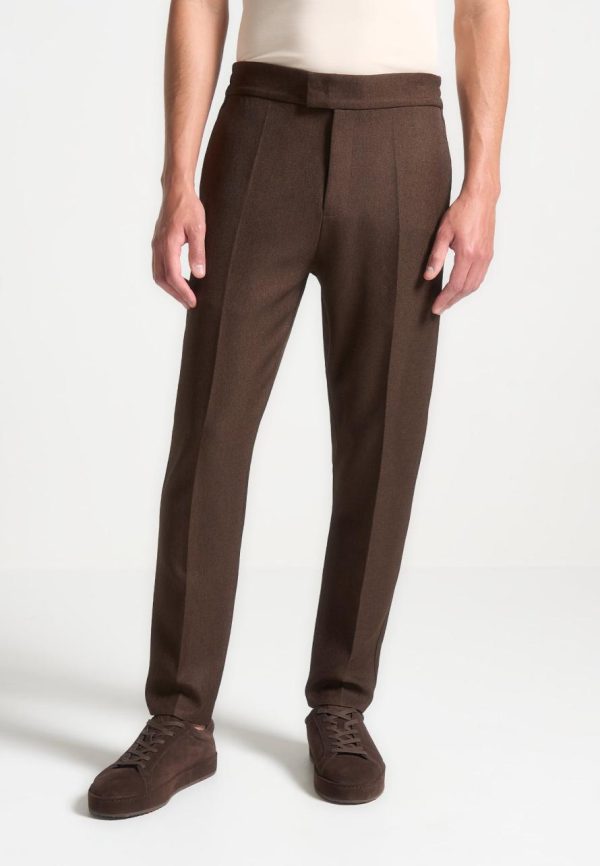 Elevate your wardrobe with our Slim Fit Tailored Trousers in Brown, featuring a modern tailored fit with a tapered hem for a refined look. With side slip pockets and a pleat to crease detail, these trousers effortlessly blend practicality with style. Perfect for both smart casual and formal occasions, these versatile trousers are a must-have addition to your collection. Pair with the Tailored Harrington Jacket in Brown for a complete ensemble.