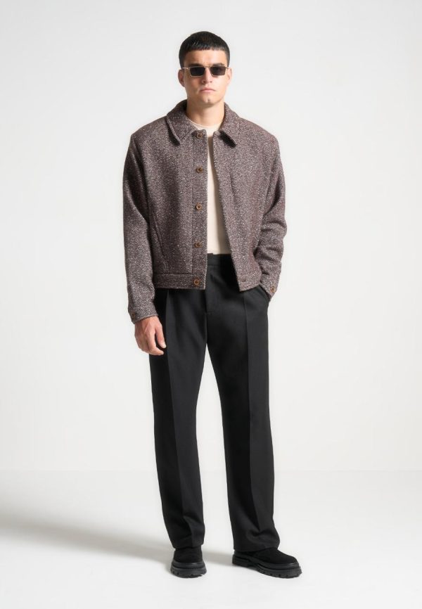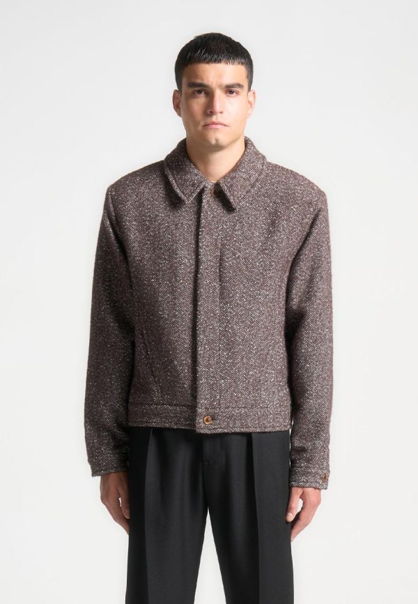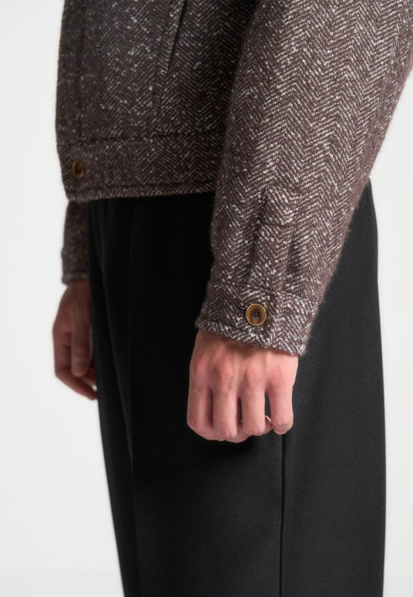 The Boxy Herringbone Jacket in Brown offers a relaxed fit with a sleek, contemporary design. Featuring discrete, hidden buttons and front welt pockets, it combines practicality with style. The durable fabric, made from a 50% wool and 50% polyester blend, ensures comfort and warmth. Pair with the Relaxed Fit Herringbone Pleated Tailored Trousers for a complete ensemble.