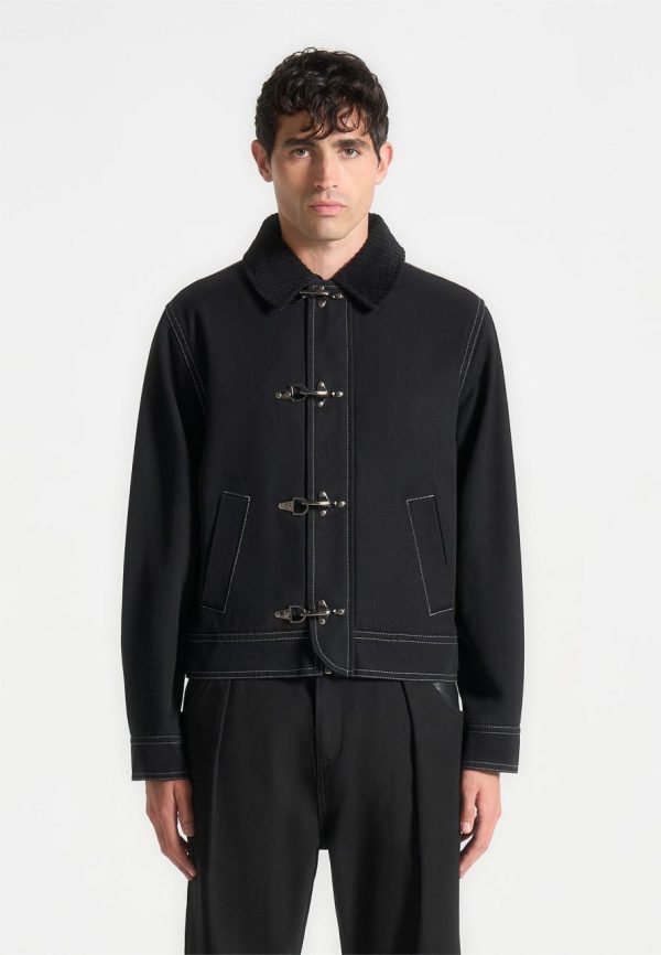 The Clasp Detail Contrast Stitch Gabardine Jacket in Black blends classic tailoring with modern touches, crafted from premium gabardine for a structured finish. Contrast stitching highlights its sleek silhouette, while distinctive clasp closures add a contemporary edge. Complete with a notched collar, streamlined sleeves, and discreet side pockets, this fully lined jacket offers both style and functionality in a tailored fit.