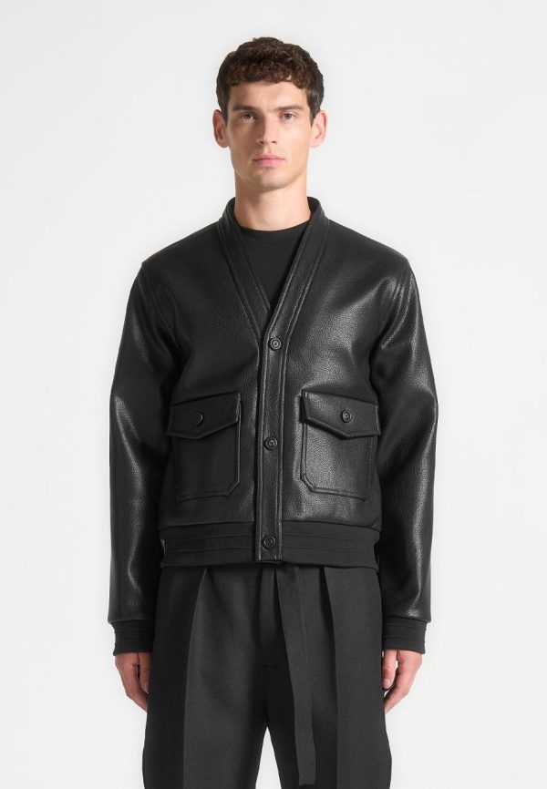 Introducing our Pebbled Leather Cardigan in Black, featuring a varsity-style silhouette for a contemporary take on a classic. The pebbled leather texture gives it a unique finish, while the elasticated hem and cuffs ensure a comfortable fit. Complete with front pockets, this Cardigan offers both style and practicality for any occasion.