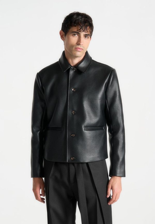 This Black Pebbled Leather Jacket offers a structured silhouette, crafted from premium textured leather for a refined, modern finish. Featuring a classic collar, full front button closure, and welt pockets, it combines minimalist design with durability. The jacket’s clean lines and tailored cut make it a versatile staple, ideal for elevating both casual and formal ensembles.