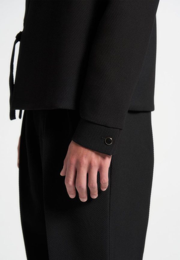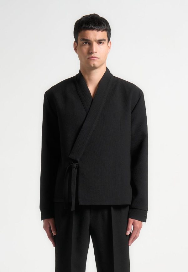 Introducing the Textured Kimono Wrap Jacket in Black, a standout addition to any wardrobe. Its distinctive textured material lends an air of refinement, while the self-tie fastening at the waist ensures a flattering silhouette. Featuring a V-neck collar and long sleeves, this jacket is the perfect choice for any occasion.