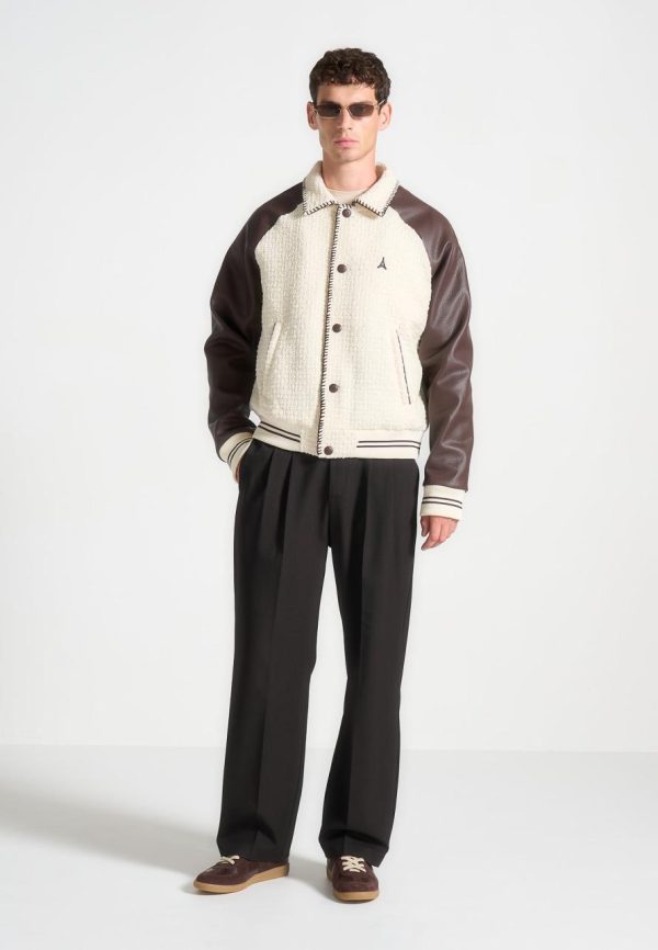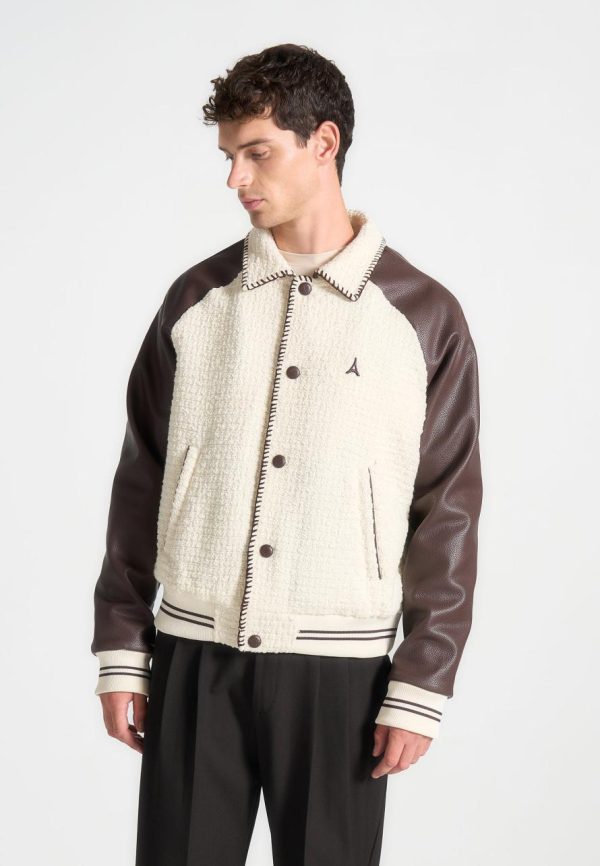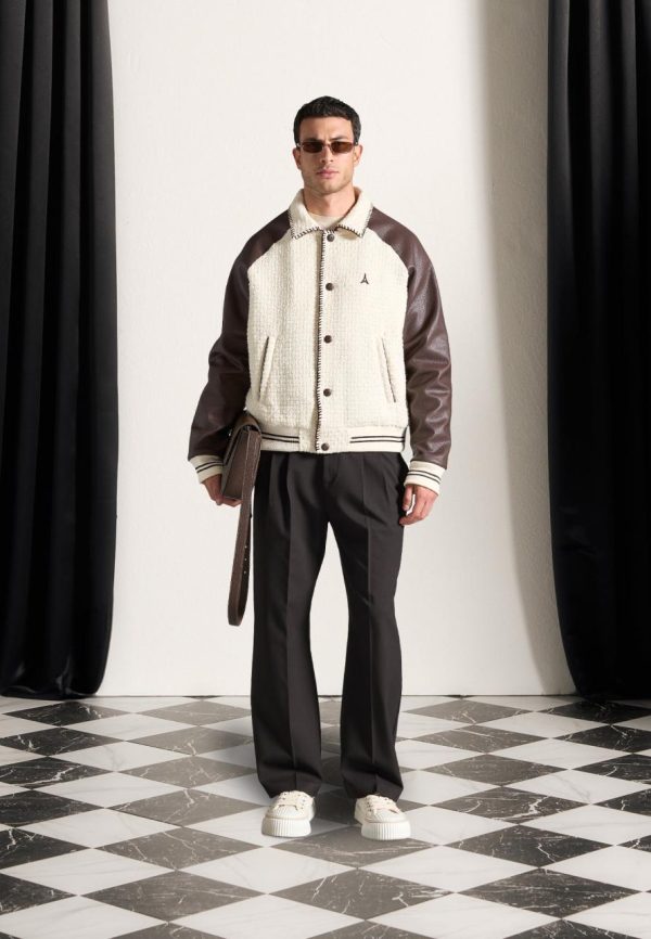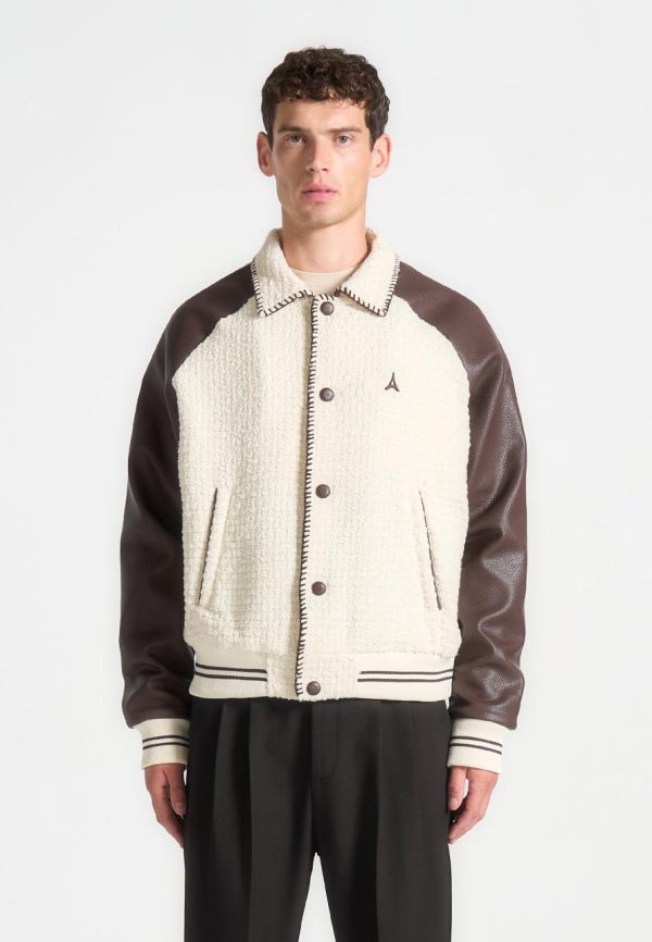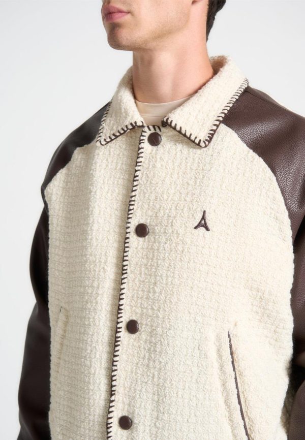 Introducing our Tweed & Leather Varsity Jacket in Cream/Brown. This Jacket merges a classic varsity silhouette with a modern whipstitch edge, showcasing a blend of premium tweed and vegan leather. Enhanced with distinctive embroidered branding, it features striped detailing on the cuffs and hem for a refined touch. Finished with a practical popper button closure, this piece strikes the perfect balance between style and functionality.