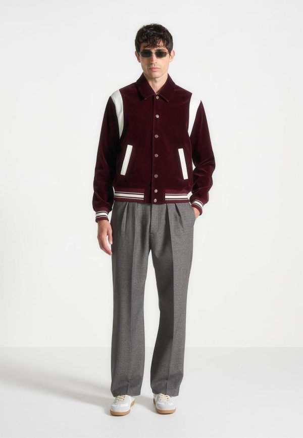 Introducing our Velvet & Satin Varsity Jacket in Wine Red. This jacket combines a classic retro silhouette with contemporary flair, featuring high quality fabrics and satin panelling. Finished with a practical, popper button closure, it offers the perfect blend of varsity style and functionality.