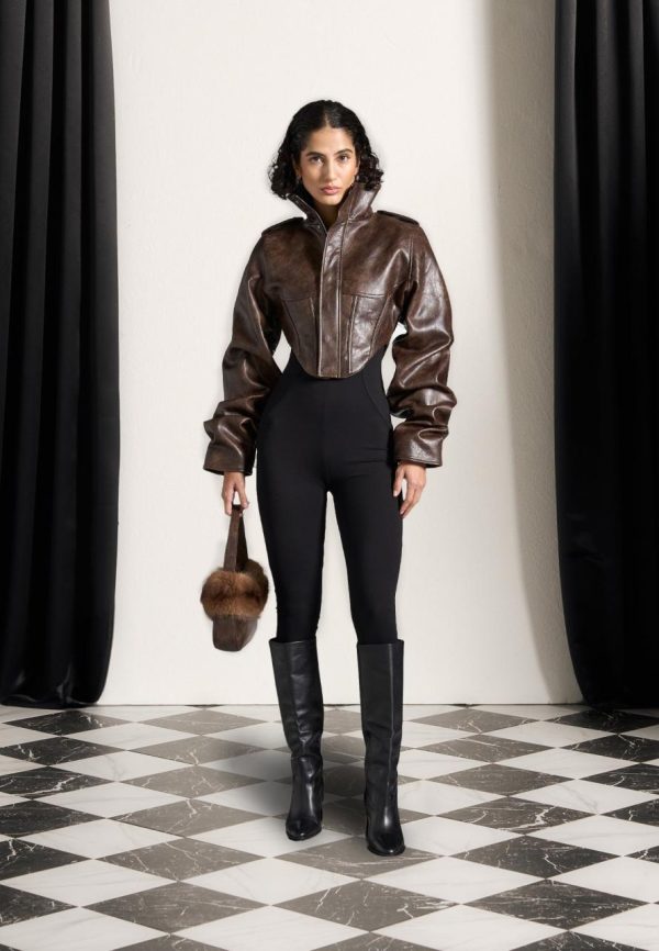 Crafted from luxurious vintage leather, this brown jacket features intricate corset detailing and a high neck with tacked sleeves. Timeless in design, this jacket adds an elegant touch to any outfit. Made to last, it is a must-have for any fashion-forward wardrobe.