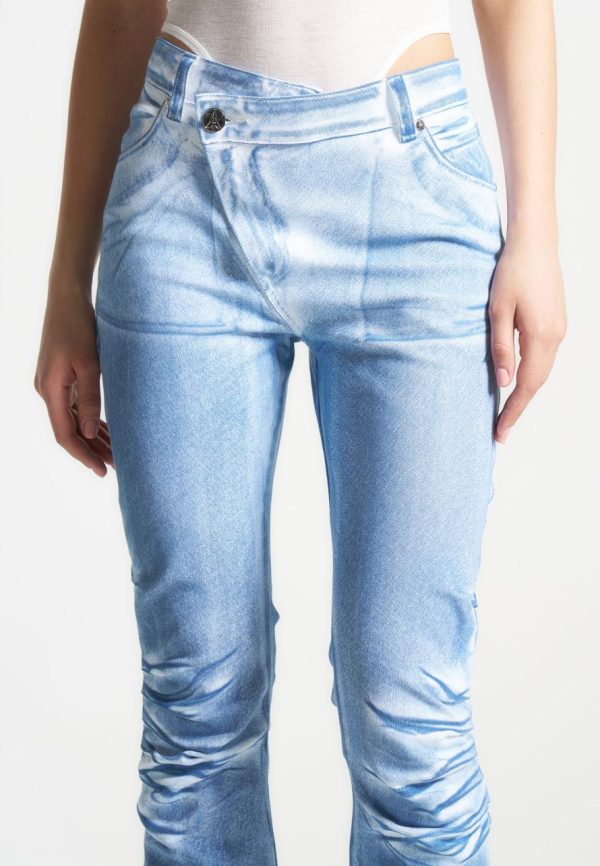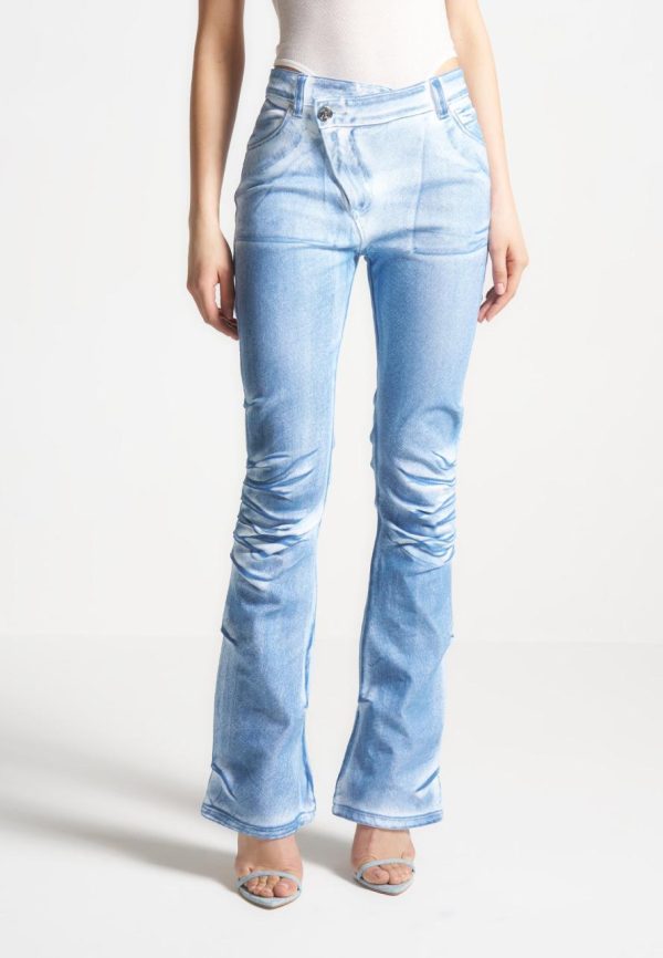 These Oil Print Tacked Fit and Flare Jeans in White and Blue offer a unique individual print on every pair, with precise tacked detailing and an asymmetric waistband adding a flattering touch. The contrasting colours add a stylish element, making these jeans a must-have statement piece for any wardrobe.