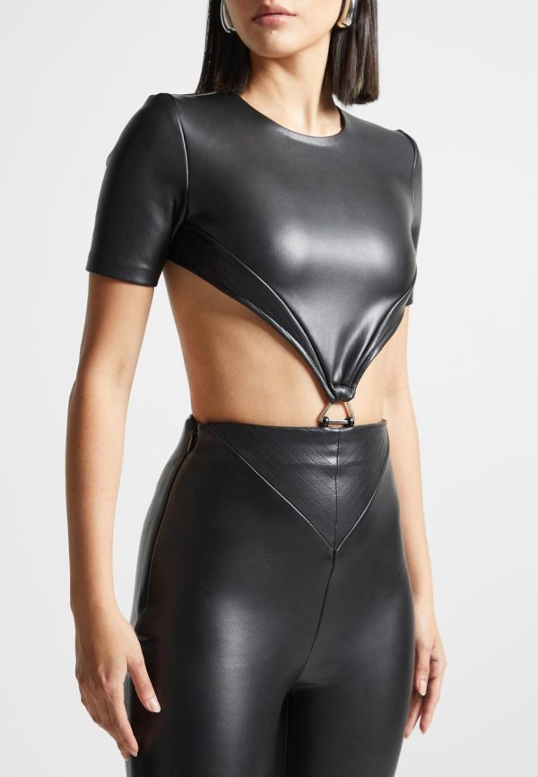 This stylish vegan leather jumpsuit is the perfect addition to your wardrobe. With a classic black hue and figure flattering design, it will be the go-to piece for any night out. Made from 100% vegan-friendly materials, you’ll have an eco-friendly look that is sure to make a statement.