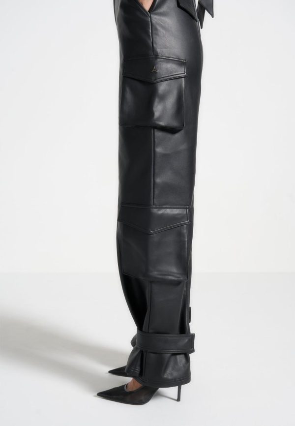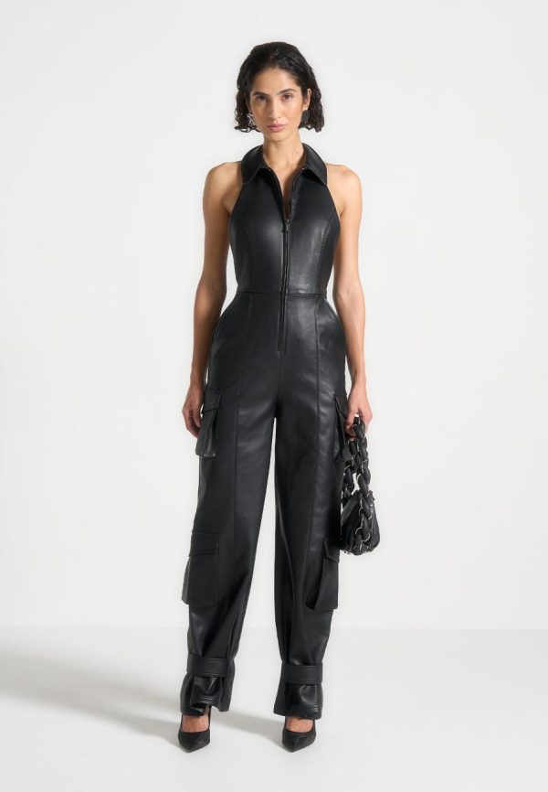 Stay chic with our Leather Halterneck Cargo Jumpsuit. Featuring cargo pockets and leg straps for added functionality, a tie neck for a touch of elegance, and an open back for a daring edge. Perfect for any occasion, this jumpsuit combines style and practicality in one stunning piece.