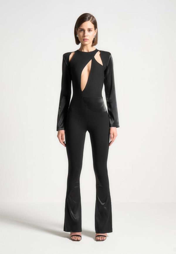 This elegant satin long sleeves and flared legs elevates this jumpsuit perfect for any evening occasion. The cut out detailing adds a sultry aspect without taking away from the sophisticated silhouette.
