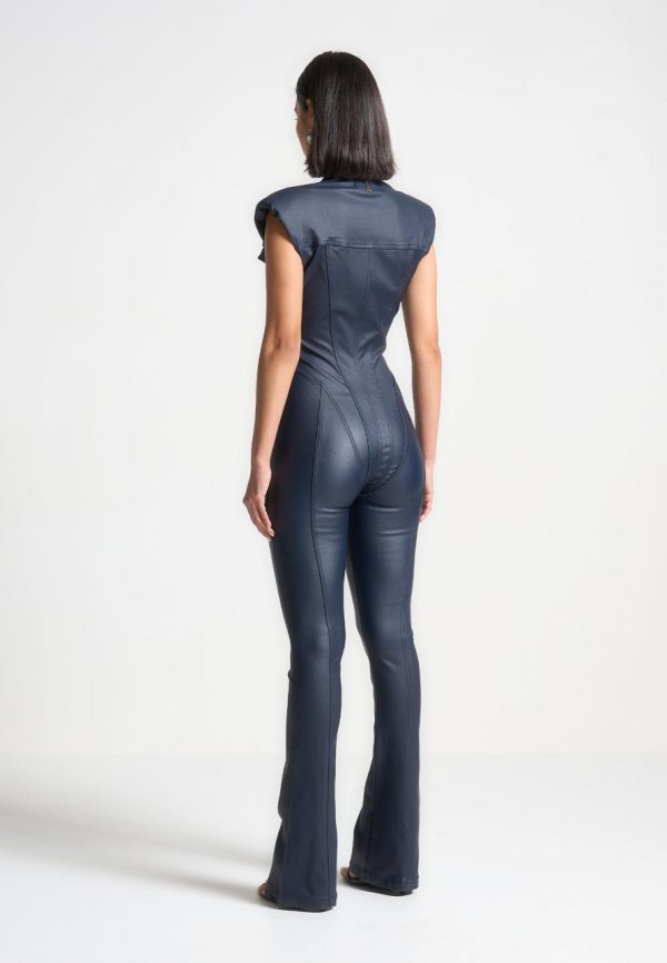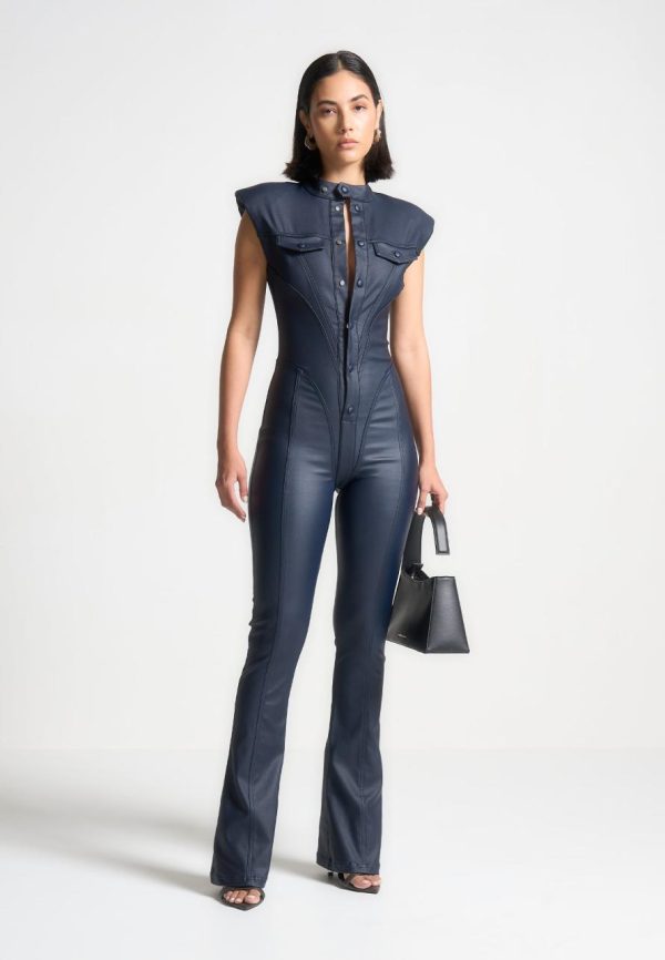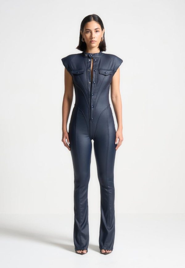 Expertly crafted with wax coating, this jumpsuit accentuates your shape with its figure flattering design and contour detailing. Its shoulder pads add structure and elegance, making it a versatile choice for any occasion. Showcase your confidence and style in this must-have jumpsuit.