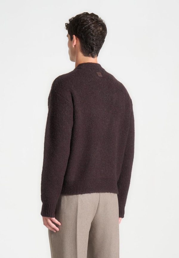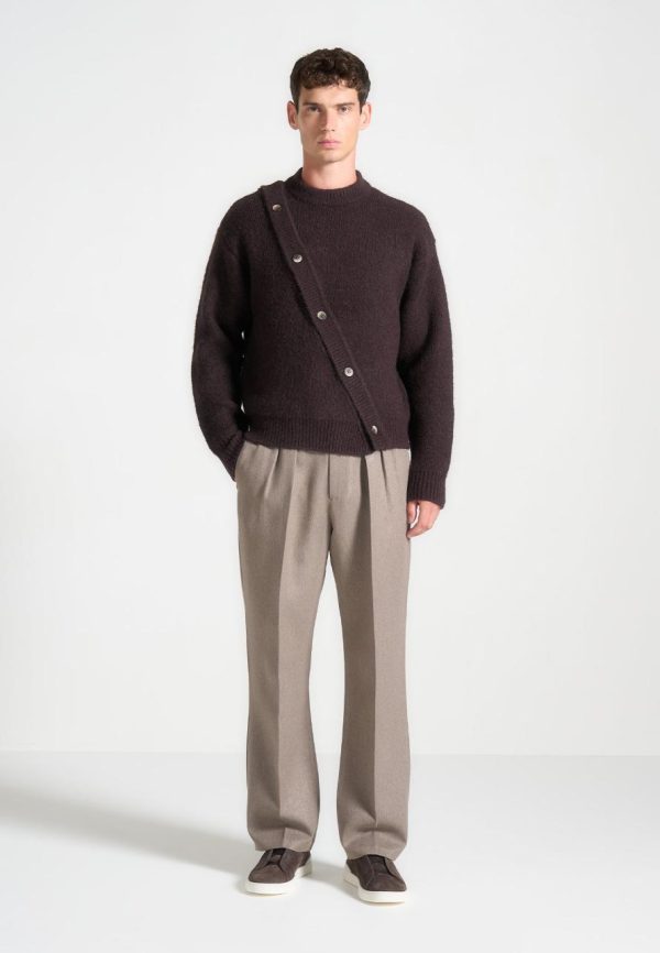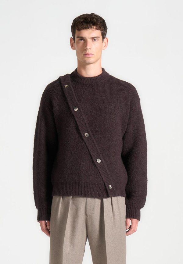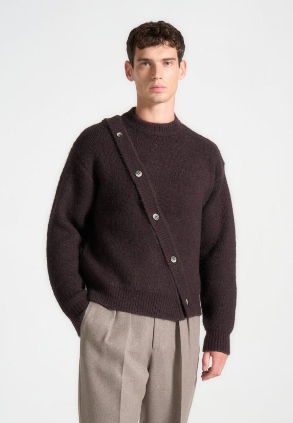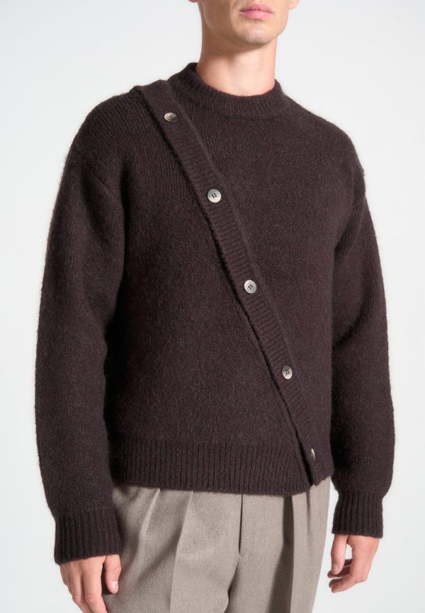 The Asymmetric Brushed Wool Knit Jumper in Brown redefines classic knitwear with a contemporary edge. Crafted from luxuriously soft wool, it boasts a striking diagonal button-up design that adds a refined, asymmetric touch. The brushed texture enhances its cosy feel, while the relaxed crewneck silhouette ensures effortless comfort. Perfect for layering or making a statement on its own, this jumper is a versatile essential for elevating your seasonal wardrobe.