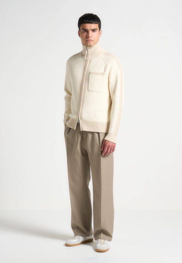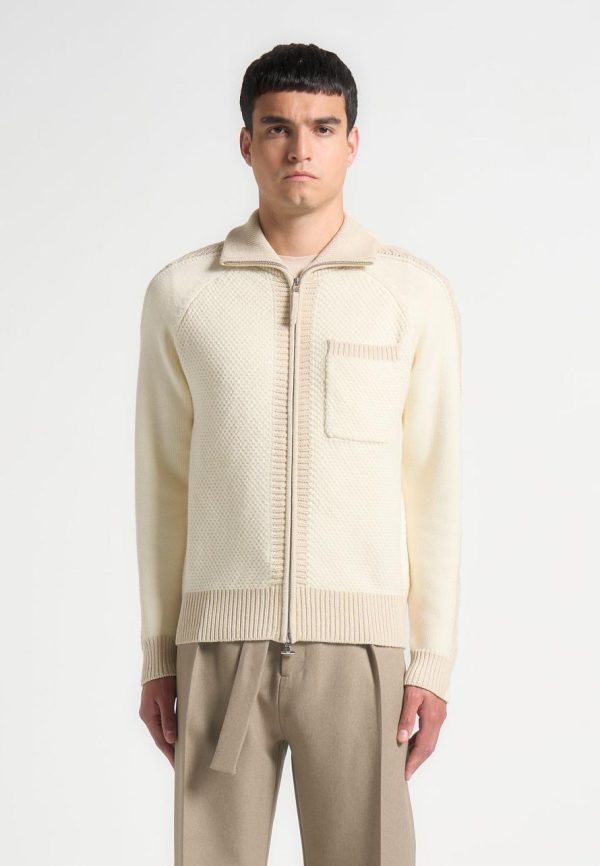 The Colour Block Zip Through Cardigan in Cream offers a contemporary twist to a classic silhouette with its unique ribbed funnel neck and contrasting textured panels. Finished with sleek Silver hardware and a front pocket for added functionality, this cardigan brings both style and versatility to any outfit.
