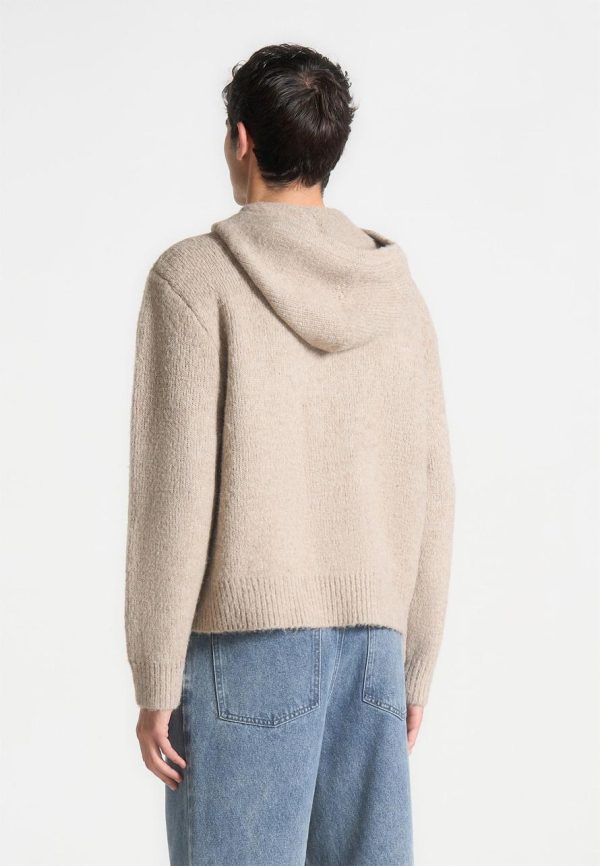 This Mohair Knit Zip Through Hoodie in Beige offers a sleek, modern look with a touch of luxury. The mohair blend texture provides a premium feel, while the regular fit ensures all-day comfort. The hooded silhouette adds a contemporary edge, making it easy to style for casual or elevated seasonal outfits. A perfect blend of comfort and style, this hoodie is a versatile wardrobe essential.
