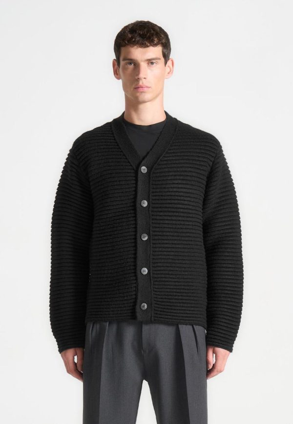 The Ribbed Knit Cardigan in Black is a versatile wardrobe essential crafted from soft, high-quality knit. Featuring a classic double-breasted design, it adds a refined touch to any outfit. The regular fit and structured silhouette ensure both comfort and style. This timeless Cardigan effortlessly transitions between seasons, making it the perfect addition to your collection.