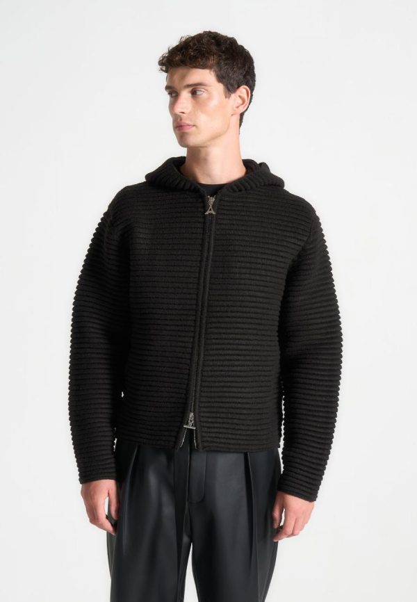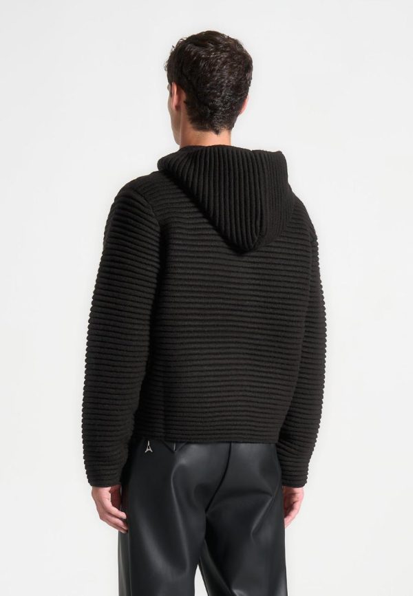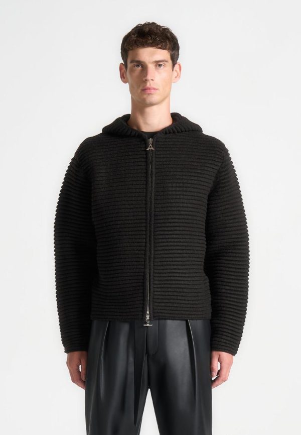 This Ribbed Knit Zip Up Hoodie in Black offers a sleek, modern look with a touch of luxury. The ribbed knit texture provides a premium feel, while the regular fit ensures all-day comfort. The hooded silhouette adds a contemporary edge, making it easy to style for casual or elevated seasonal outfits. A perfect blend of comfort and style, this hoodie is a versatile wardrobe essential.