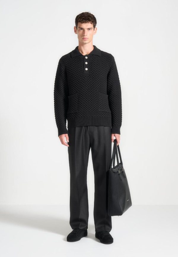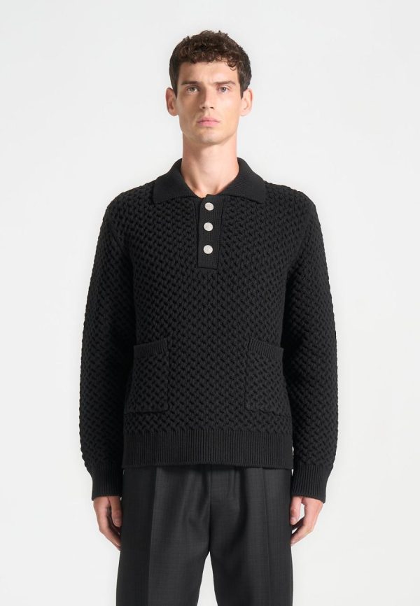 The Waffle Knit Polo Jumper in Black offers a clean, modern take on a classic staple. Made from textured waffle knit fabric, it features a button-up collar and two front pockets, blending practicality with style. Its timeless design and comfortable fit make it a go-to piece for effortless, everyday wear this season.