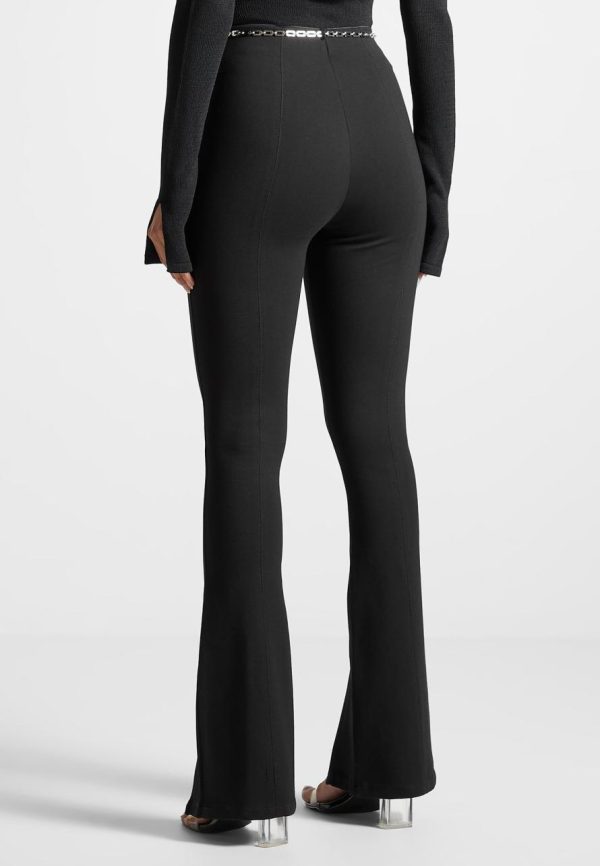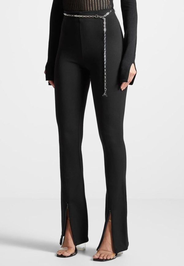 These fit and flare leggings feature dynamic split hems and a high waisted fit. The unique chain detailing is a stylish add-on and adds to the timelessness of the piece. Perfect for a night out or any other special occasion.