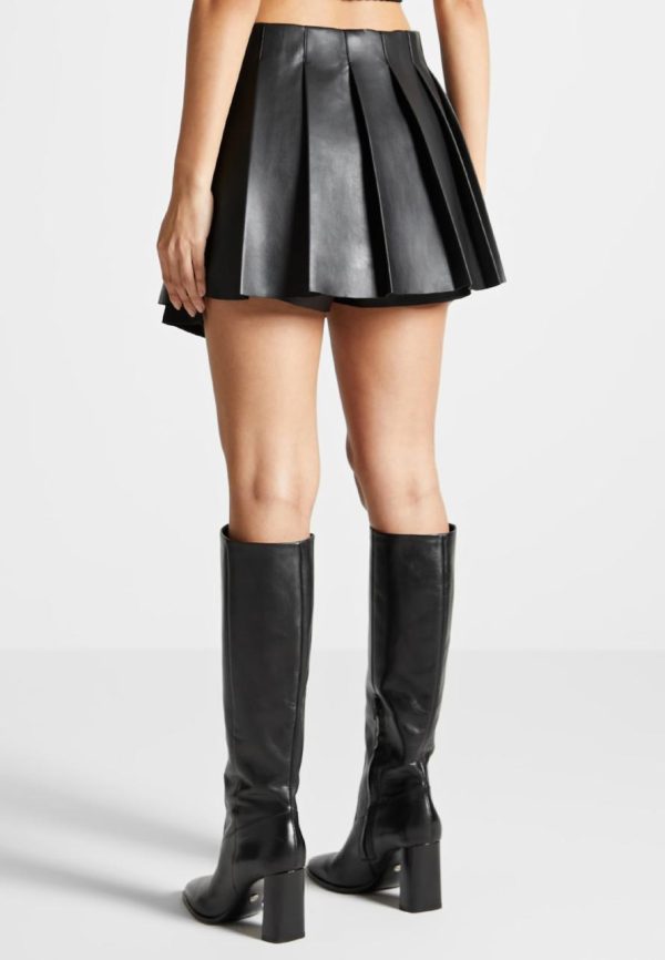 This timeless black Vegan Leather Skort combines fashion and function, with its pleated design and concealed shorts, making it perfect for any occasion.