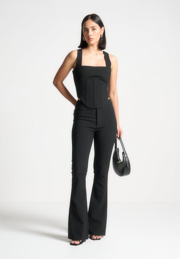 This Square Neck Pinstripe Corset Top combines a sleek and sophisticated structural design with a flattering dipped hem. The square neckline adds a touch of elegance while the pinstripe pattern adds a classic, timeless appeal. Make a statement in this black corset top.