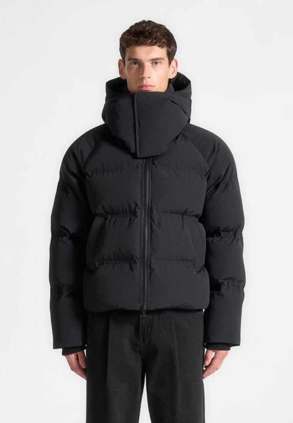 The Cropped Raglan Wrap Neck Puffer Jacket in Black is a versatile winter essential designed for warmth and durability. Featuring an insulated wrap neck and cropped design provides extra coverage, making this Puffer Jacket a staple this season.