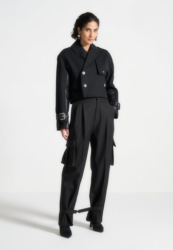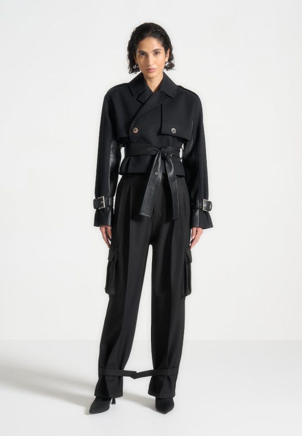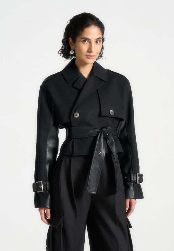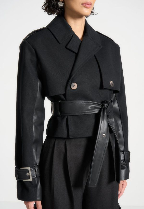 Discover the perfect blend of style and practicality. Featuring a unique contrast fabric design, this coat is both eye-catching and versatile. The belted waist adds a flattering touch, while the cropped length adds a modern twist. Elevate your wardrobe with this must-have piece.