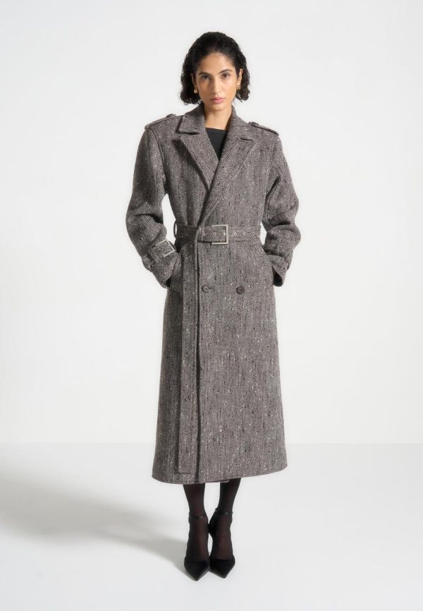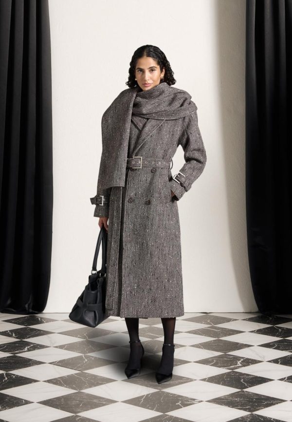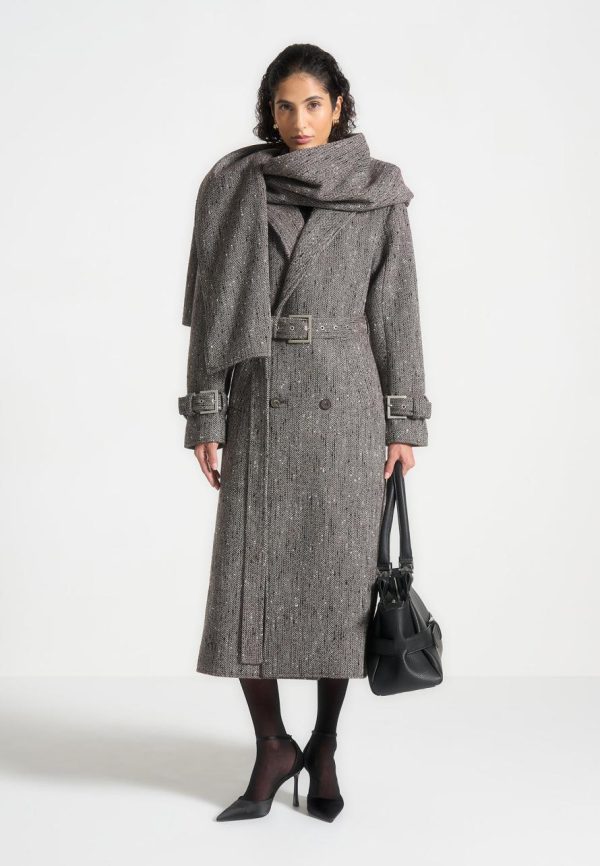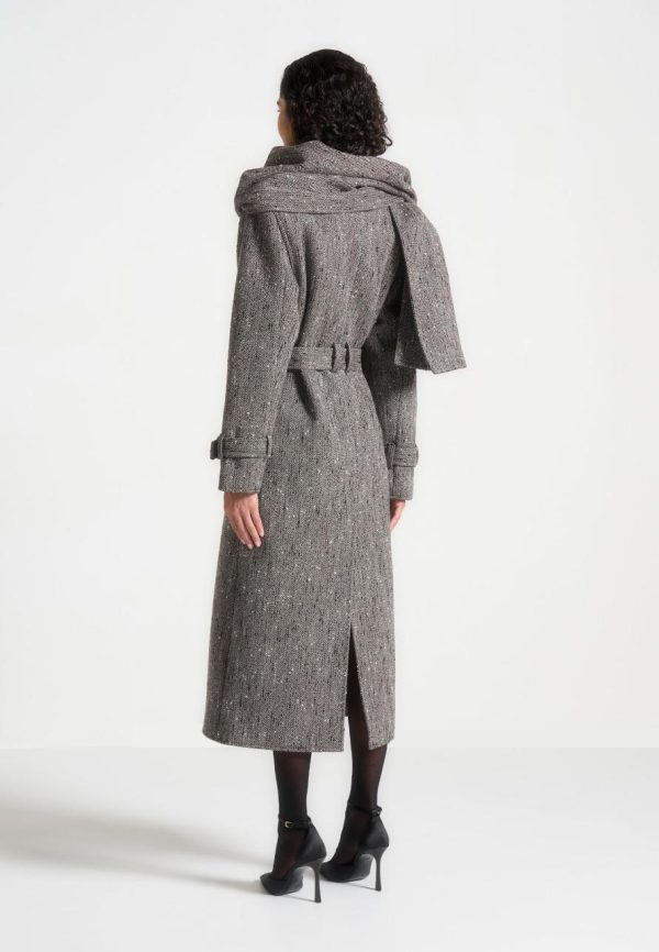 This Herringbone Wool Trench Coat features a detachable scarf and a classic longline silhouette. Stay warm and stylish this winter with this versatile and timeless piece. The detachable scarf allows for added warmth on colder days or can be removed for a more streamlined look.