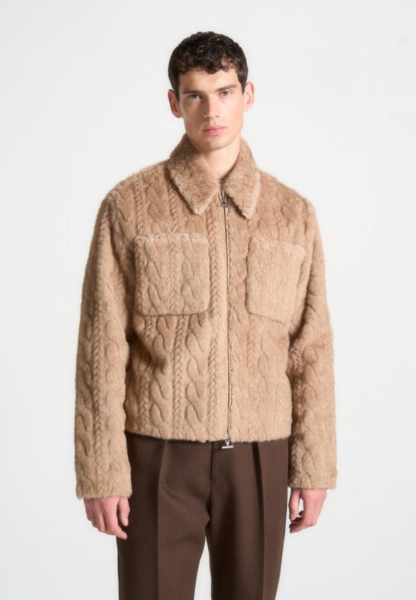 Introducing our Limited Edition Plush Cable Jacket in Taupe. Featuring a full faux plush fur construction, this Jacket offers unmatched comfort with a soft plait design to add texture. Complete with two front pockets and a zip closure, it combines practicality with a unique, refined style. Perfect for adding a statement piece to your wardrobe.