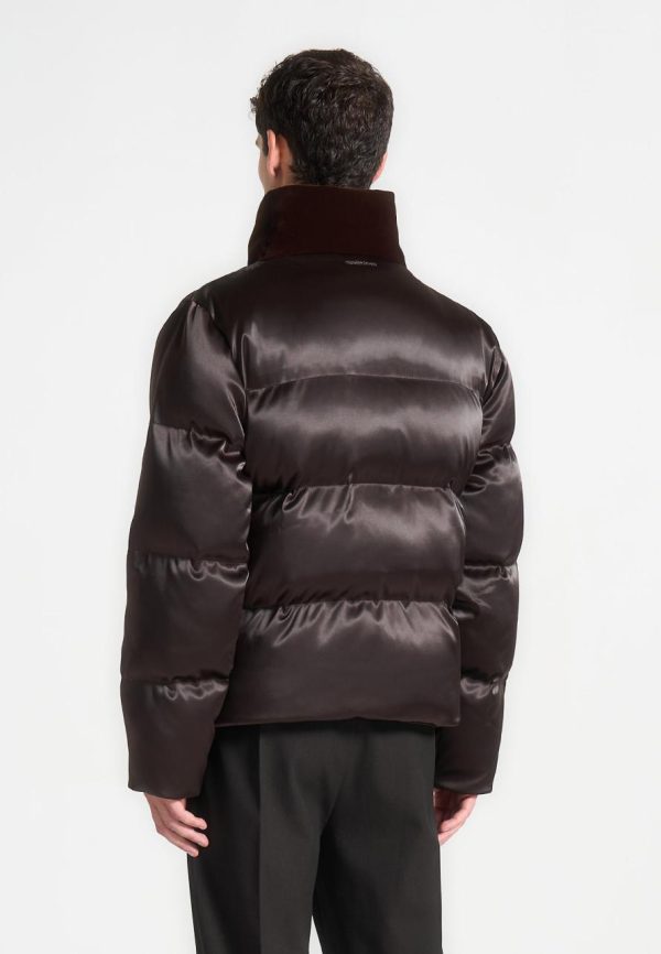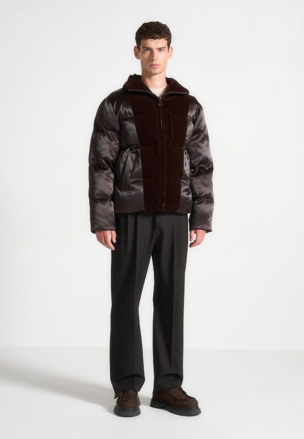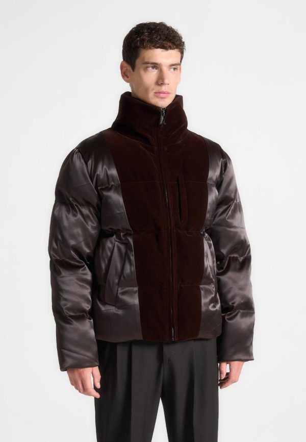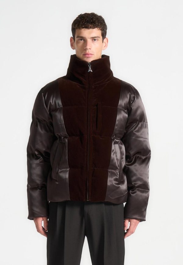 The Satin and Velvet Panelled Puffer Jacket in Brown offers a sleek, modern take on the classic puffer. Combining smooth satin with plush velvet panels, it adds texture and depth to a timeless silhouette. The high funnel neck and padded design ensure warmth, while its streamlined shape maintains a refined, minimalist look. Ideal for colder weather, this jacket strikes the perfect balance between practicality and a polished, contemporary style.