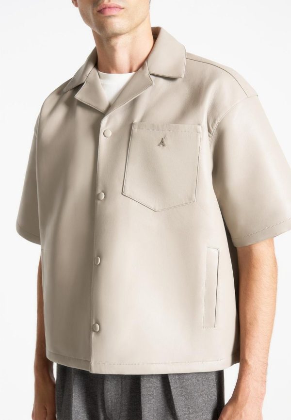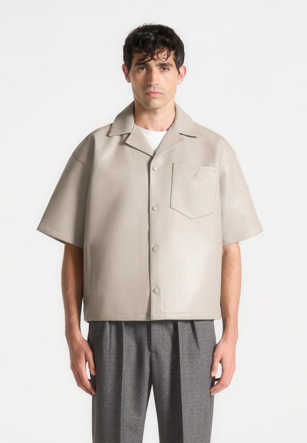 The Boxy Leather Revere Shirt in Stone offers a modern update to classic shirting with its sleek silhouette and luxurious material. Made from premium vegan leather, it has the rich look and feel of genuine leather in a versatile stone hue. Its boxy, relaxed fit allows for effortless draping and easy layering, while a front button placket adds to its minimalist design. Ideal as a statement piece or layered over a tee, this shirt combines contemporary style with refined craftsmanship for the modern wardrobe.