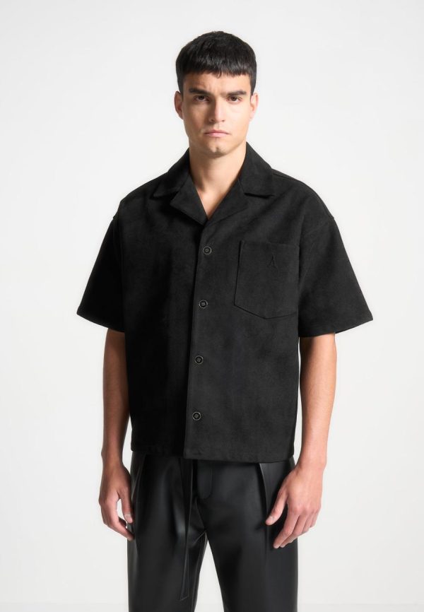 Elevate your wardrobe with the Boxy Suede Shirt in Black. This Shirt features a relaxed fit and a classic revere collar, providing a modern look. The short sleeve silhouette and front pocket adds casual practicality, while the button up fastening provides effortless wear. Crafted from 95% polyester and 5% elastane, the suede material offers a comfort and breathability making the Shirt perfect for any occasion.