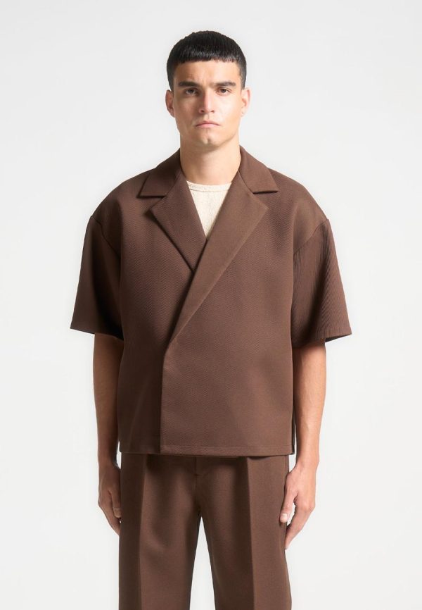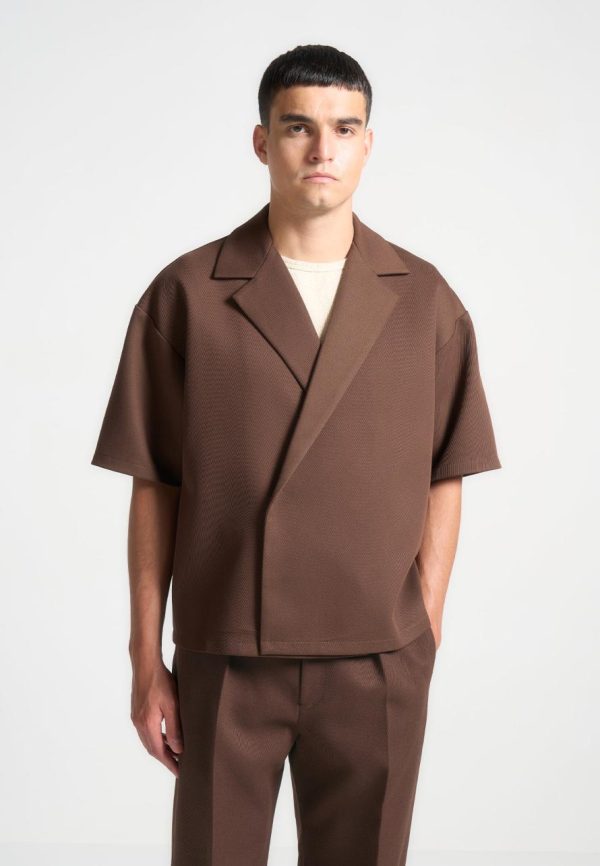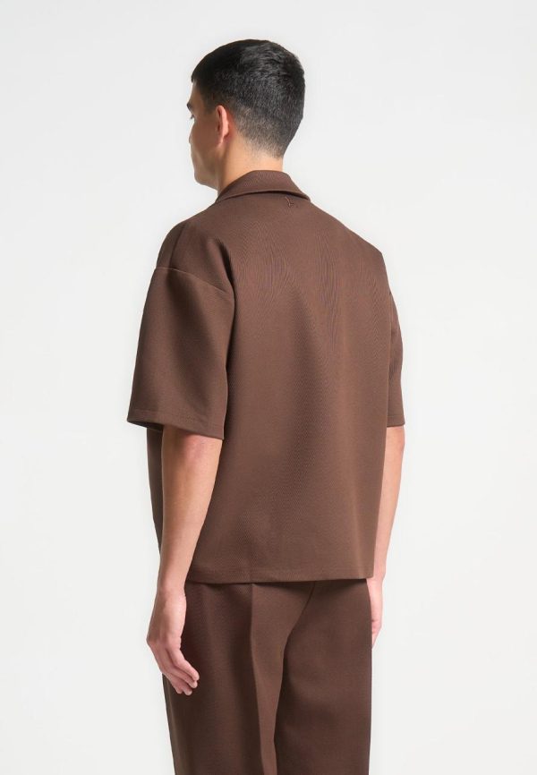 Meticulously designed with an open collar and relaxed fit, our Boxy Twill Double Breasted Shirt in Brown embodies timeless style. The short sleeve silhouette adds a contemporary touch, ensuring its versatility in any wardrobe. Stay both comfortable and polished throughout the day.