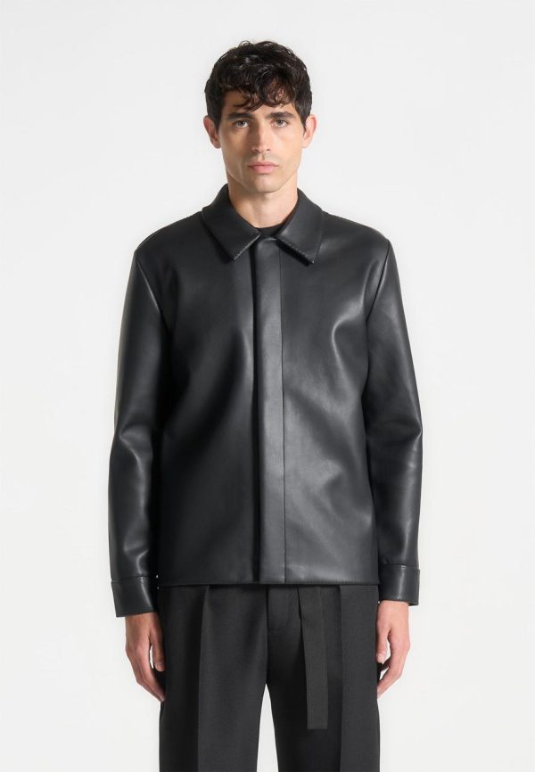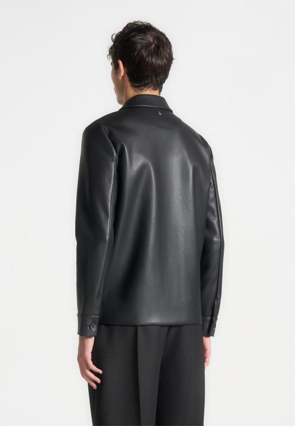 Introducing the Minimal Leather Shirt in Black, crafted from premium vegan leather fabric for a blend of comfort and style. Designed with a regular fit, this shirt features a classic collar, front button fastening, and a distinctive triangle money welt pocket for a unique touch. With a long sleeve silhouette and refined tapered cuffs, this versatile shirt is perfect for any smart casual or formal occasion.