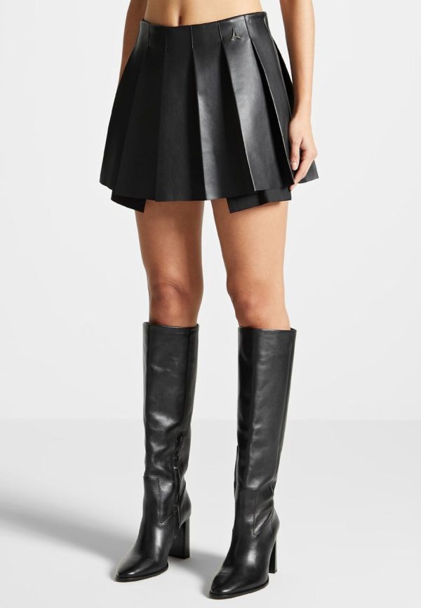 This timeless black Vegan Leather Skort combines fashion and function, with its pleated design and concealed shorts, making it perfect for any occasion.