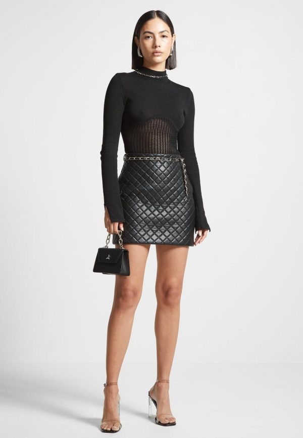 This vegan leather mini skirt is designed for fashion-forward style. The classic quilted pattern features a unique chain detail with a bold, black finish. Elevate any look with this luxurious skirt.