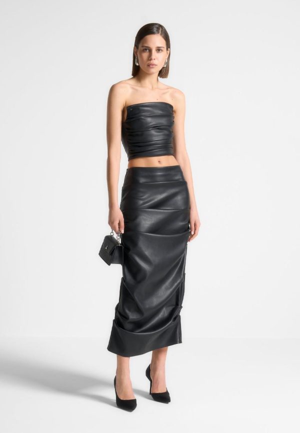 Expertly crafted with a high-waisted midaxi design, this tacked vegan leather skirt boasts a unique and timeless style. The tacked detailing adds texture and dimension to elevate any look. Make a bold statement while staying on-trend with this must-have piece.