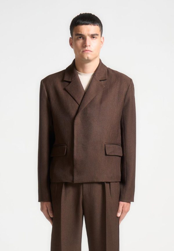 Introducing the Double Breasted Tailored Cropped Blazer in Brown, a refined addition to any wardrobe. Featuring a polished double-breasted design with a secure button fastening, this Blazer offers a regular fit and a modern cropped silhouette. The two front pockets add a practical touch, making it an ideal choice for any occasion.