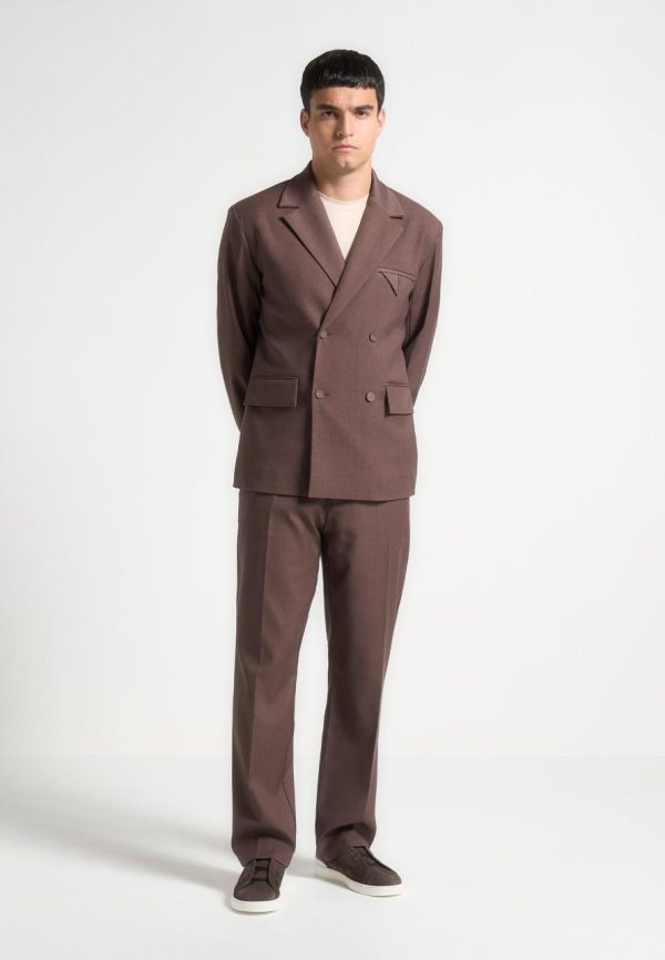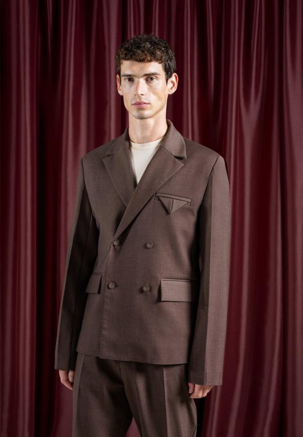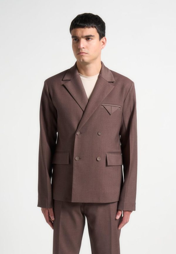 Introducing the Double Breasted Twill Suit Jacket in Brown. Crafted from durable twill fabric, this Jacket features a modern double-breasted design with a classic blazer silhouette, complete with buttons for a secure fastening to provide a regular fit. Pair with the Twill Pleated Tailored Trousers in Brown for a sharp, coordinated outfit.