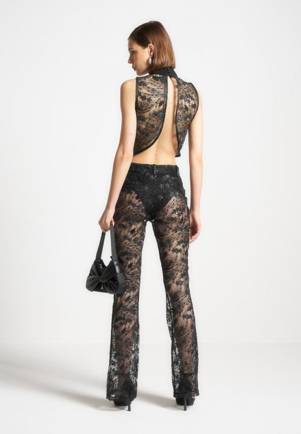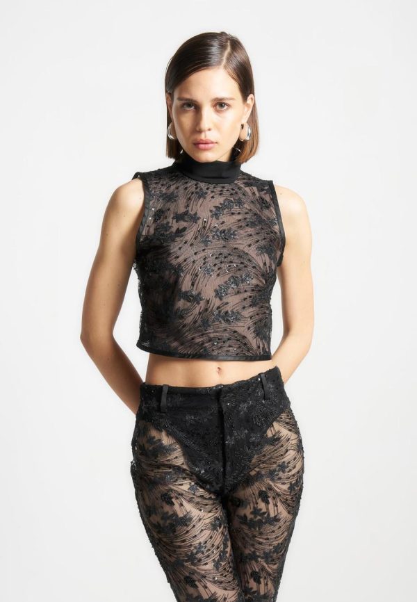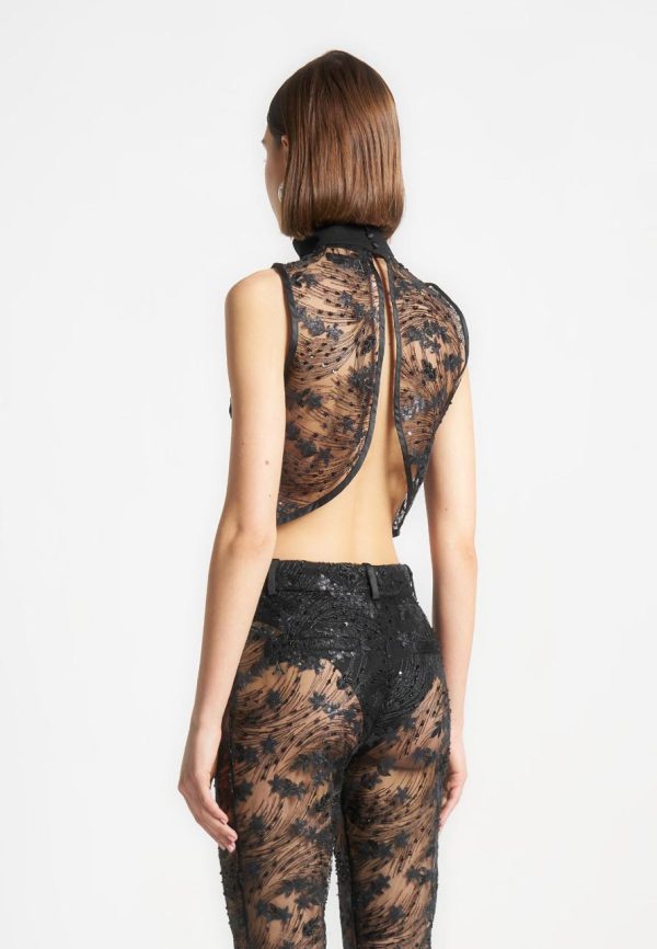 This sophisticated top features a high neck and detailed embellishment, creating a stunning and elegant look. The open back adds a touch of allure, perfect for any special occasion.