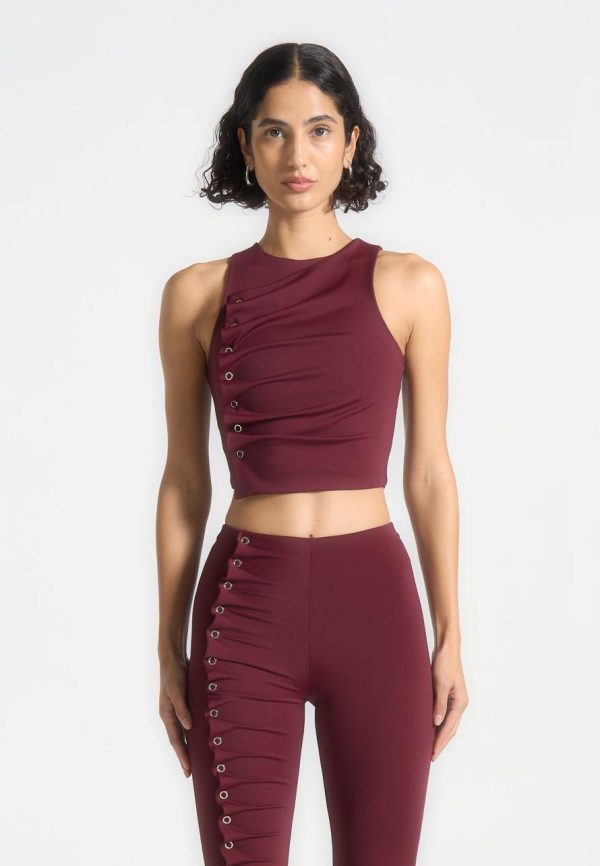 The Eyelet Detail Tacked Racer Top features eyelet ruching throughout, creating a flattering, sculpted fit that enhances your shape. Made from soft, comfortable fabric, this top combines style and ease, making it a versatile addition to any wardrobe.
